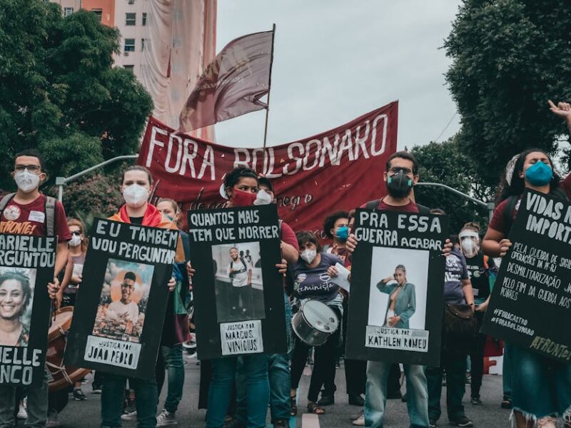 Protest in Rio de Janeiro with people holding banners demanding justice and equality.