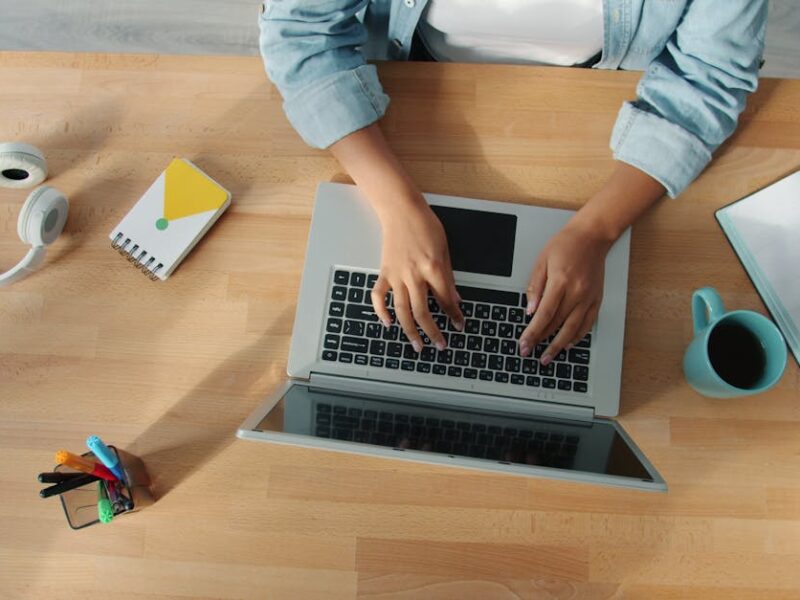 Top-down view of a person working on a laptop at a neat desk with accessories.