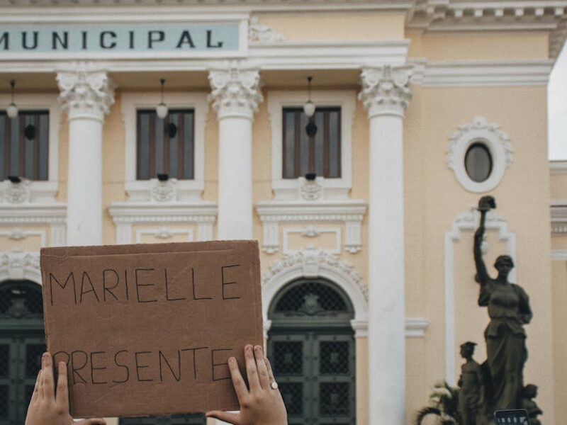 Crowd holding a sign 'MARIELLE PRESENTE' at Rio's city hall.