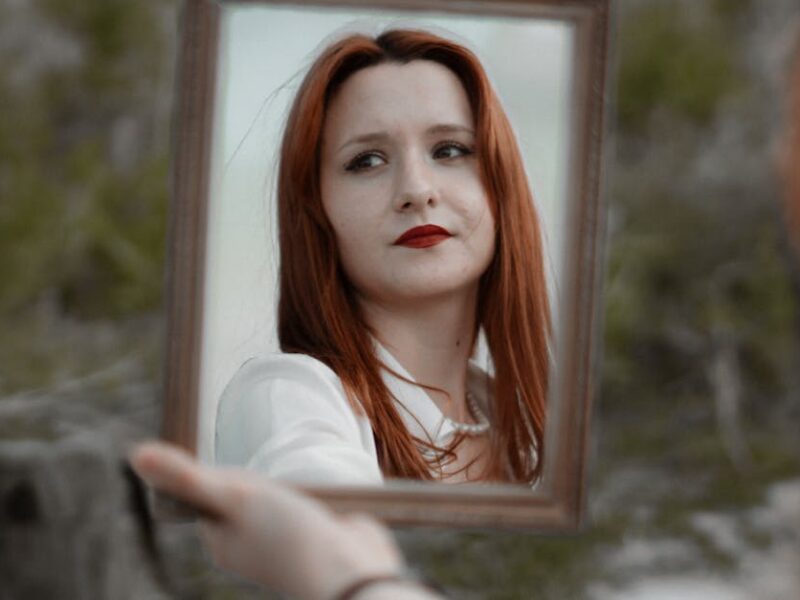 A young redhead woman holding a mirror outdoors, showcasing her reflection with red lips.