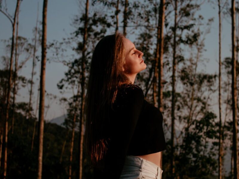 Portrait of a woman enjoying nature and freedom in a forest setting.