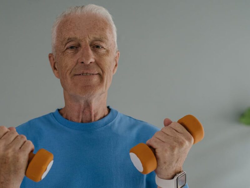Elderly man in blue shirt lifting dumbbells and smiling indoors, promoting active lifestyle.